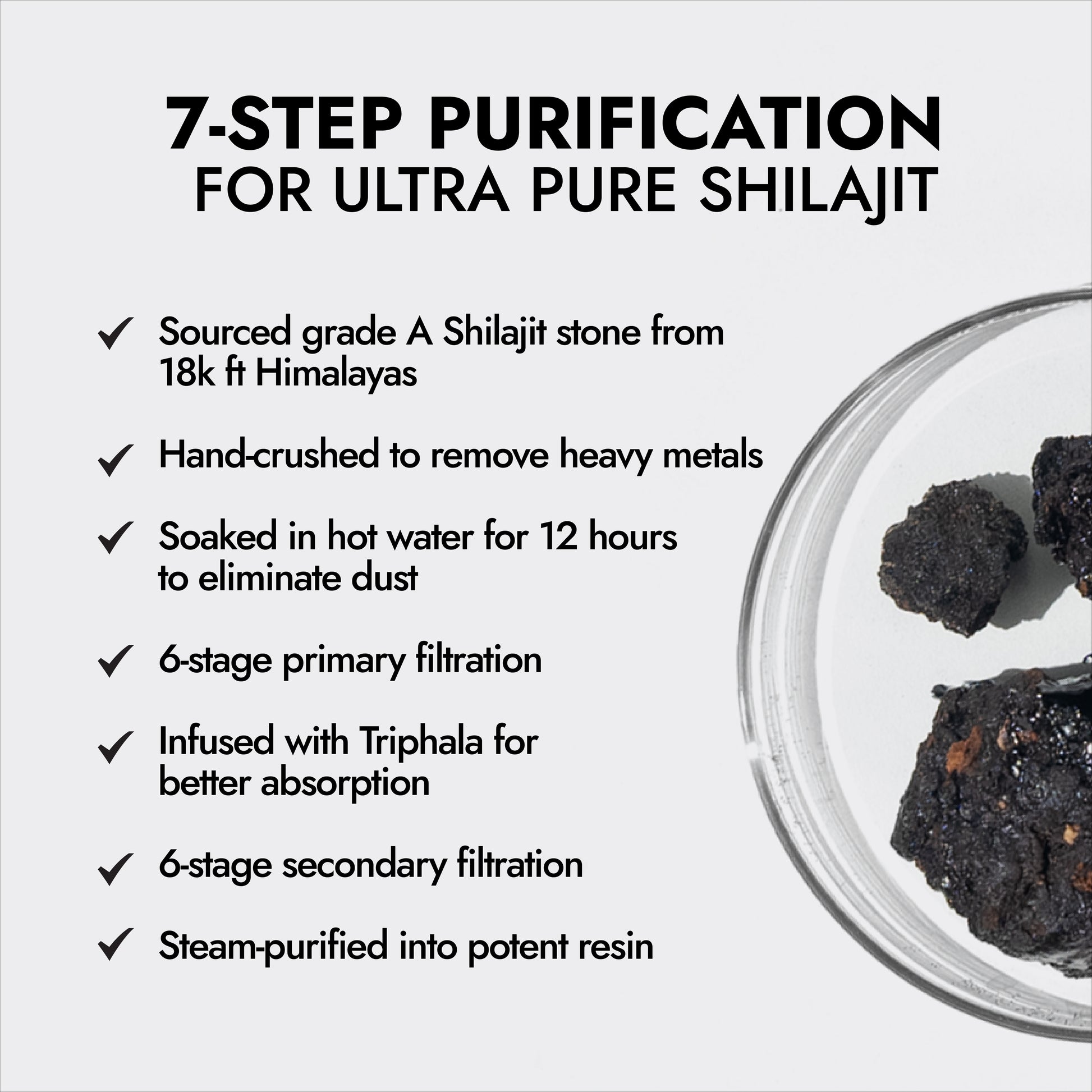We carefully source our Shilajit from 18,000 feet of the Himalayas and then traditionally purify it using the ancient Shodhana technique to produce ultra pure resin. NABL tested and manufactured in GMP-certified facilities, each pack comes with a lab report to ensure 100% purity & safe consumption.
